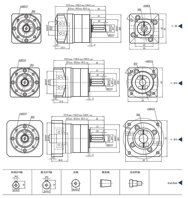 ●配電機尺寸:電機不同,與之匹配的尺寸將有所變化,適配器將不同。本公司減速機能與任何電機匹配安裝。